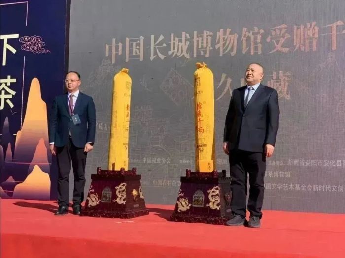 圖為2020年10月,時(shí)任湖南安化縣委書記劉勇會向中國長城博物館贈送白沙溪館藏千兩茶