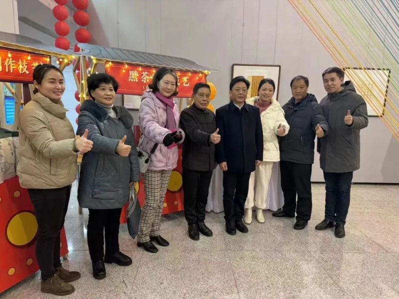 湖南省文化和旅游廳黨組成員,副廳長袁悅平(右四)、湖南省文化和旅游廳非遺處處長黃可(左三)、湖南省文化和旅游廳非遺處副處長劉斌(右二)、國家級茯磚茶制作技藝傳承人劉杏益(左四)、省級茯磚茶制作技藝傳承人黃甜(右三)合影留念